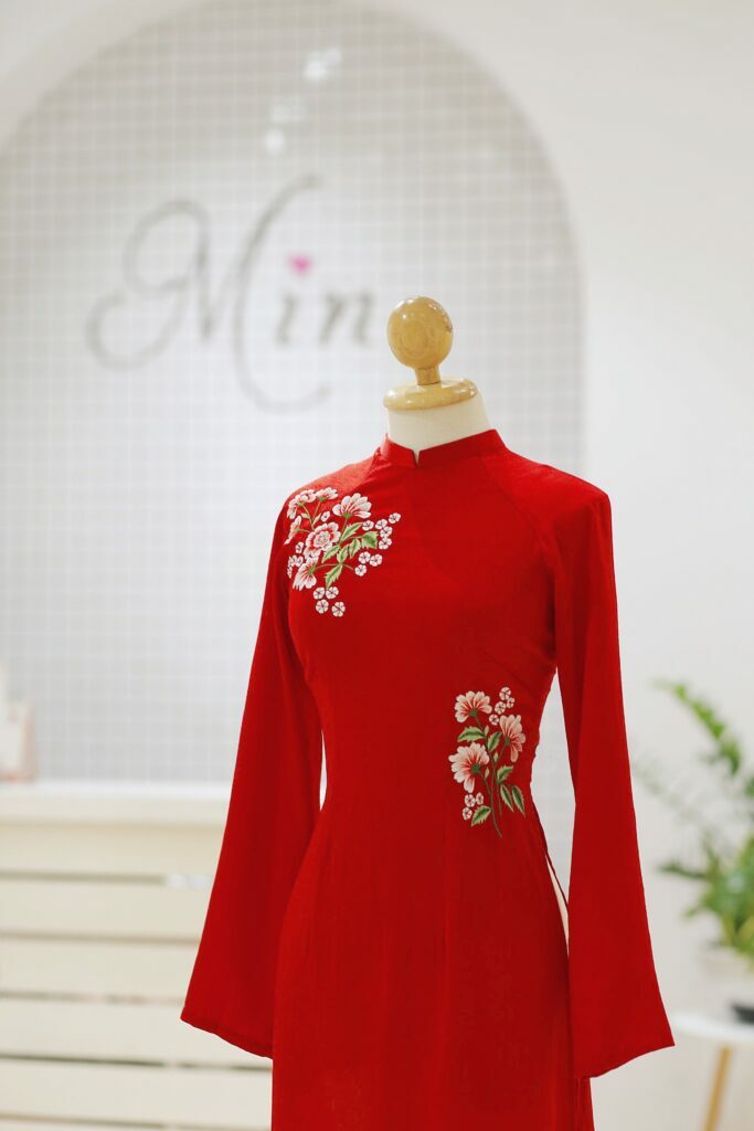 Giá Thuê: Liên hệ Chất Liệu: Lụa Tuyết Thiết kế: Thêu Hoa Màu: Đỏ